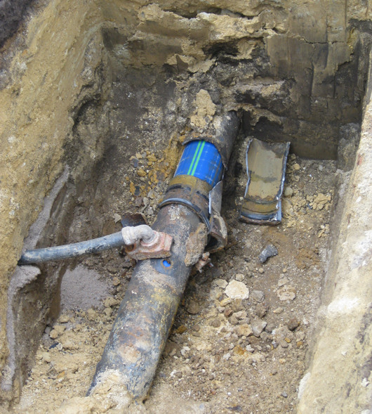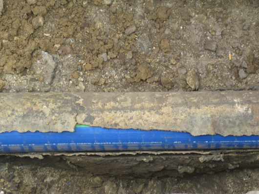 Hier wird ein neuer Hausanschluss hergestelltDeutlich erkennbar: die neue Leitung ist in das bestehende Rohr eingezogen