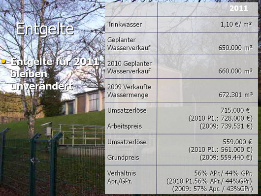 Für den Betriebszweig Wasserversorgung der Verbandsgemeindewerke wurden die Entgelte für das Jahr 2011 und der Wirtschaftsplan beschlossen. Eine Erhöhung der “Wassergebühren” ist nicht vorgesehen.