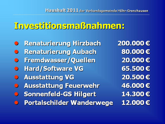 Wie in den vergangenen Jahren wurden im Haushaltsplan 2011 nur die notwendigsten Ausgaben veranschlagt, um den zur Verbandsgemeinde Höhr-Grenzhausen gehörenden Gemeinden einschließlich der Stadt, noch möglichst viel an finanziellem Spielraum zu überlassen. Allerdings wird aus meiner Sicht das Jahr 2011 zu einer Herausforderung für unsere Kommunen werden. Änderungen im Landesfinanzausgleichsgesetz und der Umzug der Unternehmen Trelleborg und Syngenta werden sich auswirken.