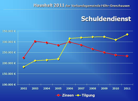 Der Ergebnishaushalt des Haushaltsplanes 2011 schließt mit einem Defizit von knapp 69.000,00 € ab. Im Finanzhaushalt 2011 wird mit einem negativen Abschluss und damit mit einer Kreditfinanzierung von rund 165.000,00 € gerechnet. Dieser neuen Darlehensaufnahme steht eine Kredittilgung in Höhe von 339.000,00 € gegenüber. Der Schuldenstand wird sich im Jahr 2011 somit weiter verringern.