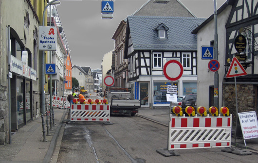 Endlich, werden die Anlieger und Geschäftsinhaber sagen, ist ein Ende der Bauarbeiten in der Mittelstraße absehbar. Am Montag, 31.01.2011, soll die Asphaltdecke eingebaut werden. “Das hätte auch früher und schneller gehen können”, habe ich in den letzten Tagen gehört. Nun ja, leider mussten noch Abstimmungsgespräche mit Versicherung und dem Baulastträger (für Planung, Bau, Betrieb und Erhaltung einer öffentlichen Einrichtung zuständige öffentlich-rechtliche Körperschaft, hier das Land, weil es sich um eine Landesstraße handelt) vorgenommen werden und dadurch kam es zum erneuten Stillstand in dieser Woche. Dafür wird die Decke jetzt bis in den Einmündungsbereich “Alexanderplatz” erneuert. Die Schlaglöcher vor der Töpferapotheke gehören dann auch der Vergangenheit an.