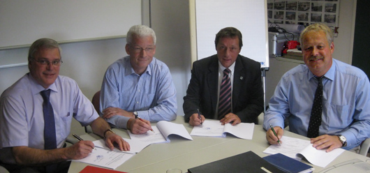 Bei der Vertragsunterzeichnung, von links: Stadtbürgermeister Michael Thiesen, FGK Geschäftsführer Dr. Ralf Diedel, Landrat Achim Schwickert, ECREF Geschäftsführer Prof. Peter Quirmbach