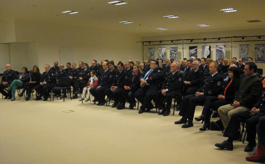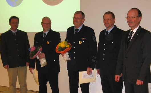 Doch damit der Ehrungen nicht genug. Es ist schon besonders bemerkenswert, dass an diesem Abend auch Mitglieder der Freiwilligen Feuerwehr für ihr 45-jährige aktive Mitgliedschaft geehrt werden konnten. Diese lange Zugehörigkeit ist auch auf die Gründung der Jugendfeuerwehr Höhr-Grenzhausen vor 45 Jahren zurückzuführen. Heute ist die Jugendfeuerwehr die wichtigste “Quelle” für den Nachwuchs der aktiven Feuerwehr. Den Väter der Jugendfeuerwehr kann man nur Weitsicht bescheinigen. Mit dem Goldenen Feuerwehrehrenzeichen für 45 Jahre treue Pflichterfüllung wurden durch Landrat Schwickert die Feuerwehrmänner Werner Scherz und Karl-Heinz Schmidt (beide Feuerwehr Höhr-Grenzhausen) ausgezeichnet. Vom damaligen ersten Jahrgang war noch Wolfgang Schröder anwesend, der heute Leiter der Berufsfeuerwehr Koblenz ist.