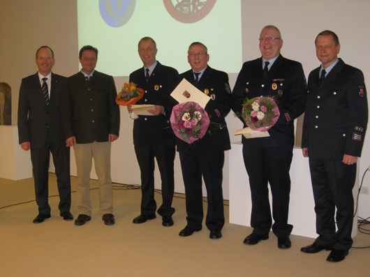 Für die aktive Tätigkeit in der Freiwilligen Feuerwehr erhielten das Silberne Feuerwehrehrenzeichen Christoph Bartel (Feuerwehr Hillscheid), Rene Dommermuth (Feuerwehr Hilgert) und Andreas Höwer (Feuerwehr Höhr-Grenzhausen. Das Goldene Feuerwehrehrenzeichen für 35 Jahre treue und gewissenhafte Pflichterfüllung überreichte Landrat Achim Schwickert an Axel Simonis (Feuerwehr Hilgert), Thomas Kosel und Guido Paulus (beide Feuerwehr Höhr-Grenzhausen).