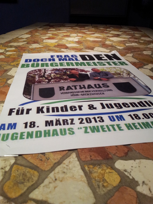 Kein Jugendlicher hatte den Weg in die “Zweite Heimat” gefunden um bei dem ersten Termin zu “Frag doch mal den Bürgermeister” Fragen an Michael Thiesen oder mich zu stellen. Dennoch am nächsten Termin wird festgehalten, am 13. Juni 2013, 18.00 Uhr, dann im “Treff34”, Rheinstraße 34, Höhr-Grenzhausen.