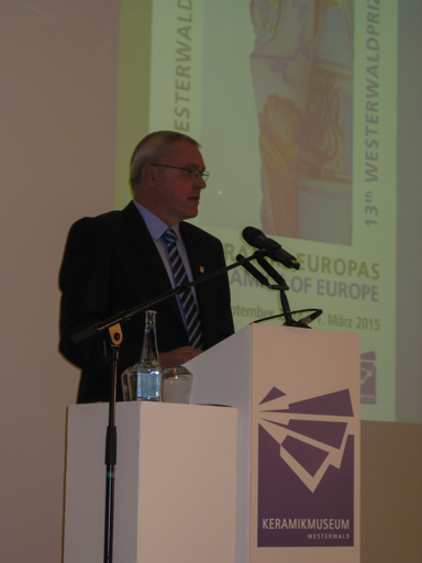 Stadtbürgermeister Michael Thiesen verlieh den Preis der Kannenbäckerstadt. In seiner Rede ging er auf die Geschichte der Keramik in Höhr-Grenzhausen ein. Die Preisverleihung erfolgte unter Beteiligung von Staatsministerin Eveline Lemke, Herrn Dr. Werner Langen, Mitglied des Europaparlaments und Landrat Achim Schwickert. Weitere Redner waren der Fraktionsvorsitzende der SPD Landtagsfraktion Hendrik Hering und die Fraktionsvorsitzende der CDU Julia Klöckner. Zu den Gästen im Keramikmuseum zählten auch der Bundestagsabgeordnete Dr. Andreas Nick und die Landtagsabgeordneten Gabi Wieland und Dr. Tanja Machalet.