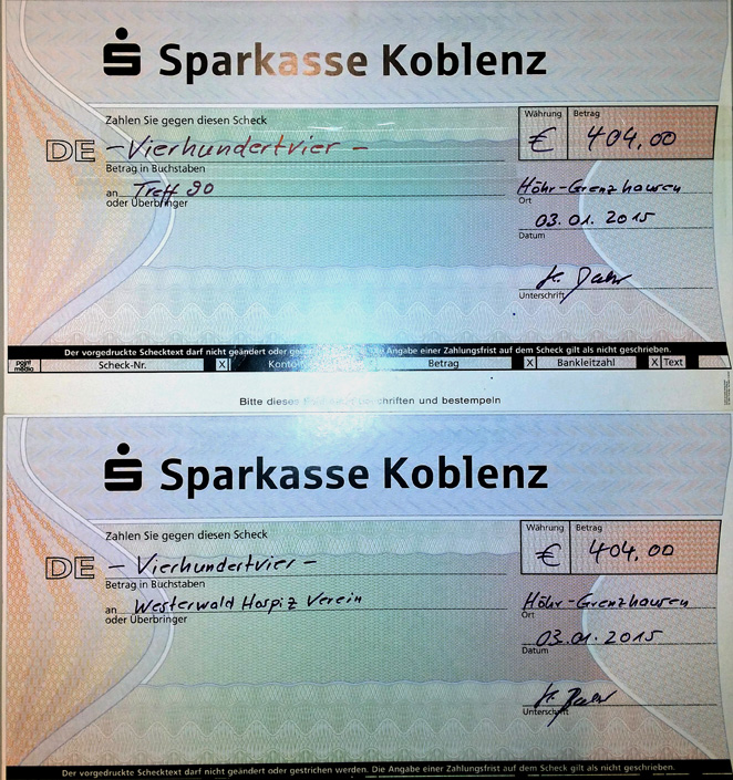 Weiterhin erfreulich war die schon seit vielen Jahren gepflegte Tradition des Fan-Clubs in Höhr-Grenzhausen und der Region Spendengelder für gemeinnützige Zwecke zur Verfügung zu stellen. Stellvertretend für den “Treff 90” in Höhr-Grenzhausen und den Dernbacher Hospiz-Verein durfte ich “Spendenschecks” in Höhe von jeweils 404,00 € entgegennehmen.