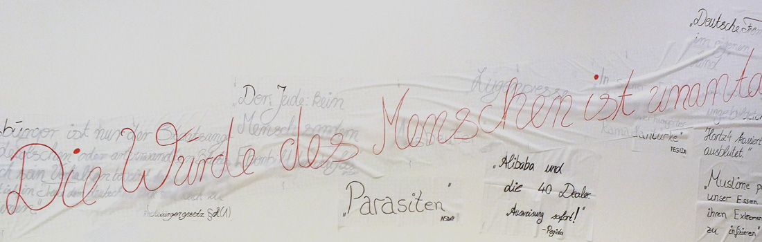 Erstmals wurden heute Fakten zu den Biografien der ehemaligen 24 jüdischen Mitbürgerinnen und Mitbürger vorgetragen. Die Biografien werden in einer auf mehrere Jahre angelegten Projektarbeit durch die Schülerinnen und Schüler der Ernst-Barlach-Realschule plus erstellt. Es war ergreifend, als die jungen Damen und Herren, jeweils kurz den Lebensweg skizzierten und die Verwandtschaftsverhältnisse aufzeigten. Hierzu legten die Mitschülerinnen und Mitschüler aus dem Gymnasium die entsprechenden Keramikplatten beieinander. Durch den Leistungskurs Geschichte des Gymnasiums wurden Parolen aus der NS-Zeit und Parolen der aktuellen PEGIDA-Demonstrationen plakativ hervorgehoben. Mit dem Fazit: Die Würde des Menschen ist unantastbar.
