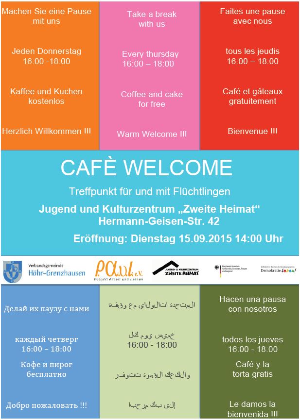 Gestern kam es im Rathaus zu einem zweiten Treffen von ehrenamtlichen Helfern. Hierbei wurde auch ein wenig Unmut gegenüber der Verwaltung geäußert und die Frage gestellt warum bisher die angebotene ehrenamtliche Hilfe nicht abgerufen wurde. Das soll sich jetzt ändern, gemeinsam mit PAuL e.V. werden wir die ehrenamtliche Unterstützung koordinieren. Um die Helfer und Flüchtlinge in einen ersten Kontakt zu bringen, eröffnen wir einen wöchentlichen Treffpunkt das “Cafe Welcome”. Erstmals am 15. September um 14.00 Uhr und dann wöchentlich jeden Donnerstag von 16.00 Uhr bis 18.00 Uhr wird das “Cafe Welcome” im Jugendhaus Zweite Heimat angeboten.