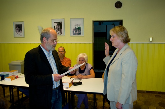 Johannes Vogel (links) ernennt und vereidigt Frau Marianne Karthaus zur Ortsbürgermeisterin